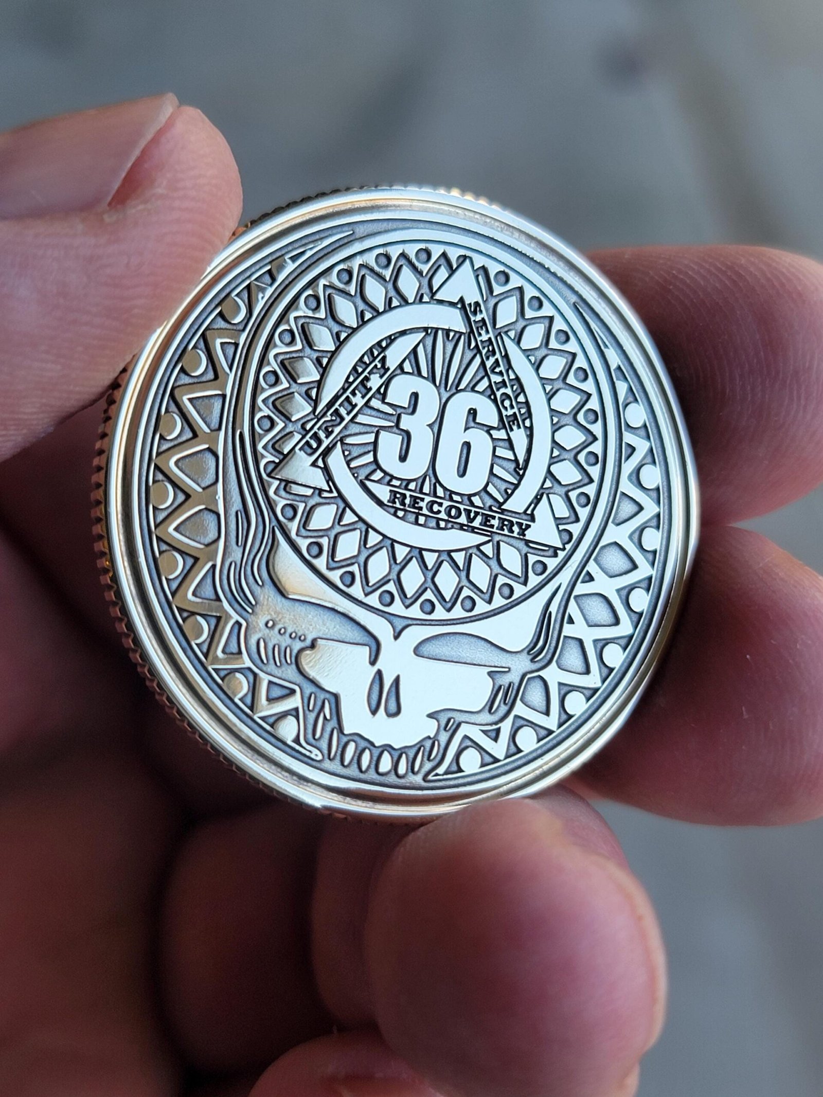 Inspiration Move Me Brightly recovery anniversary medallion. 40mm x 3mm. Please leave your years and date in the personalization section. Thank you!